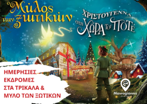 Η Ιστορία ξεκίνησε κάπως έτσι… όπως κάθε χρόνο έτσι και φέτος, κάτι καινούριο συμβαίνει στον Μύλο των Ξωτικών.. μια νέα ιστορί εκεί όπου ο χρόνος σταματά και η φαντασία ξυπνά, φέτος τα όνειρααποκτούν φτερά. Ο Πίτερ Παν πετά πάνω απ τα φώτα των Χριστουγέννων, παρέα με την Τίνκερμπελ, τη Γουέντι και τα παιδιά της Χώρας του Ποτέ. Ανάμεσά τους, ο Άγιος Βασίλης,με το βλέμμα του να λάμπει, περιμένει τις ευχές των παιδιών και σκορπίζει στολίδιαχαράς και αγάπης σε κάθε γωνιά του Μύλου. Το Ταχυδρομείο των Ξωτικών γεμίζει με επιθυμίες και μικρά όνειρα, ενώ στο Δεντρόσπιτοτης Τίνκερμπελ πέφτει απαλά χρυσόσκονη πάνω στα γέλια των παιδιών. Ο Παιδότοποςτου Μύλου γίνεται βασίλειο παιχνιδιού και φαντασίας, το Παγοδρόμιο αστράφτει κάτωαπό τα φώτα, κι απ το Εργοστάσιο Σοκολάτας ξεχύνονται μυρωδιές που θυμίζουν παιδικές αναμνήσεις. Οι μικροί επισκέπτες ζωγραφίζουν πρόσωπα, ζουν τις «ΗμέρεςΠαραμυθιού» και γυρίζουν τον Τροχό της Βιολάντα, κερδίζοντας δώρα και μικράθαύματα. Κι όταν πέφτει η νύχτα, τα φώτα λάμπουν σαν αστέρια και ο Μύλος γεμίζει με ήχους, γέλιακαι ιστορίες. Εκεί, κάθε επισκέπτης ανακαλύπτει πως μέσα του ζει ακόμη το παιδί που δενμεγαλώνει ποτέ. Γιατί στη Χώρα του Ποτέ, στον Μύλο των Ξωτικών, τα Χριστούγεννα δεντελειώνουν  απλώς αρχίζουν ξανά, κάθε φορά που κάποιος πιστεύει στο όνειρο. Το απόγευμα 16.00 αναχώρηση απο το Μύλο για την Αθήνα με ενδιάμεση στάση.  Μια απόδραση για μικρούς και μεγάλους Τιμή: 35€/ παιδί 25€