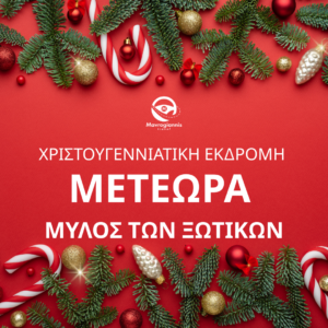 Ημερήσια στον Μύλο Ξωτικών. Αναχώρηση από Αθήνα με προορισμό τον Μύλο των Ξωτικών και τα Τρίκαλα. Θα πραγματοποιήσουμε σύντομη ενδιάμεση στάση για καφέ και θα φτάσουμε στο καλύτερο και μεγαλύτερο Χριστουγεννιάτικο θεματικό Πάρκο της χώρας μας, τον Μύλο των Ξωτικών. Ένας χώρος που έχει προσελκύσει μικρούς και μεγάλους ανοίγει και φέτος τις πύλες του.